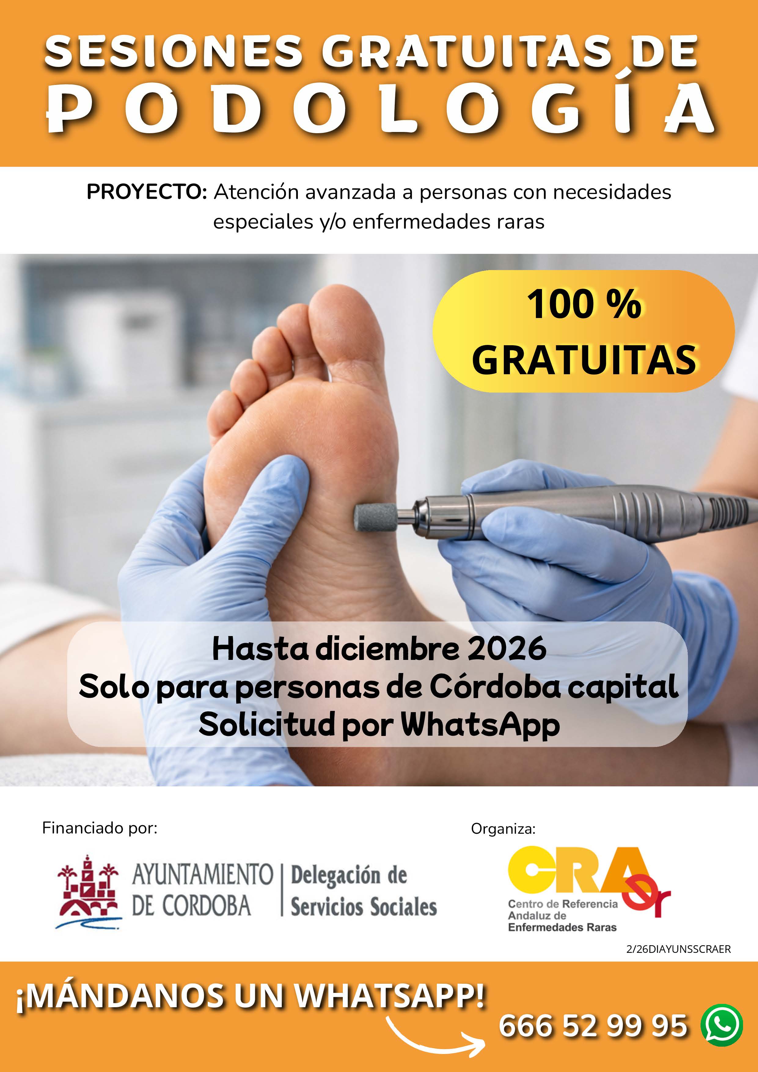 Dentro del proyecto de atención avanzada a personas con necesidades especiales y/o enfermedades raras, se ofrecen sesiones de podología 100 % gratuitas dirigidas exclusivamente a personas de Córdoba capital. Esta iniciativa estará disponible hasta diciembre de 2026 y tiene como objetivo facilitar el acceso a una atención especializada que contribuya al bienestar y al cuidado de la salud podológica.