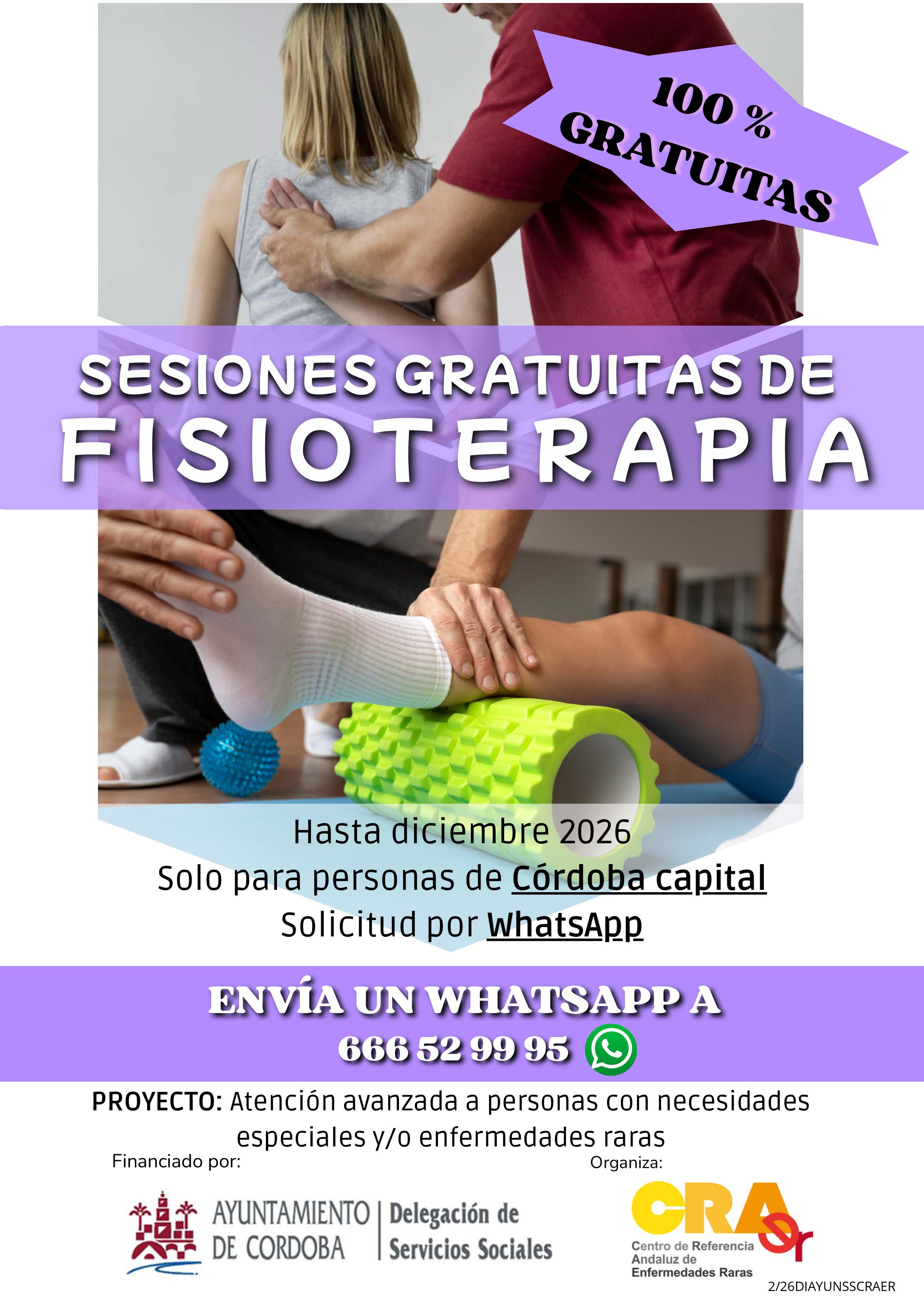 Dentro del proyecto de atención avanzada a personas con necesidades especiales y/o enfermedades raras, se ofrecen sesiones de fisioterapia 100 % gratuitas dirigidas a personas de Córdoba capital. Esta iniciativa, disponible hasta diciembre de 2026, tiene como finalidad facilitar el acceso a una atención especializada que contribuya al bienestar físico, la mejora funcional y la calidad de vida de las personas beneficiarias.