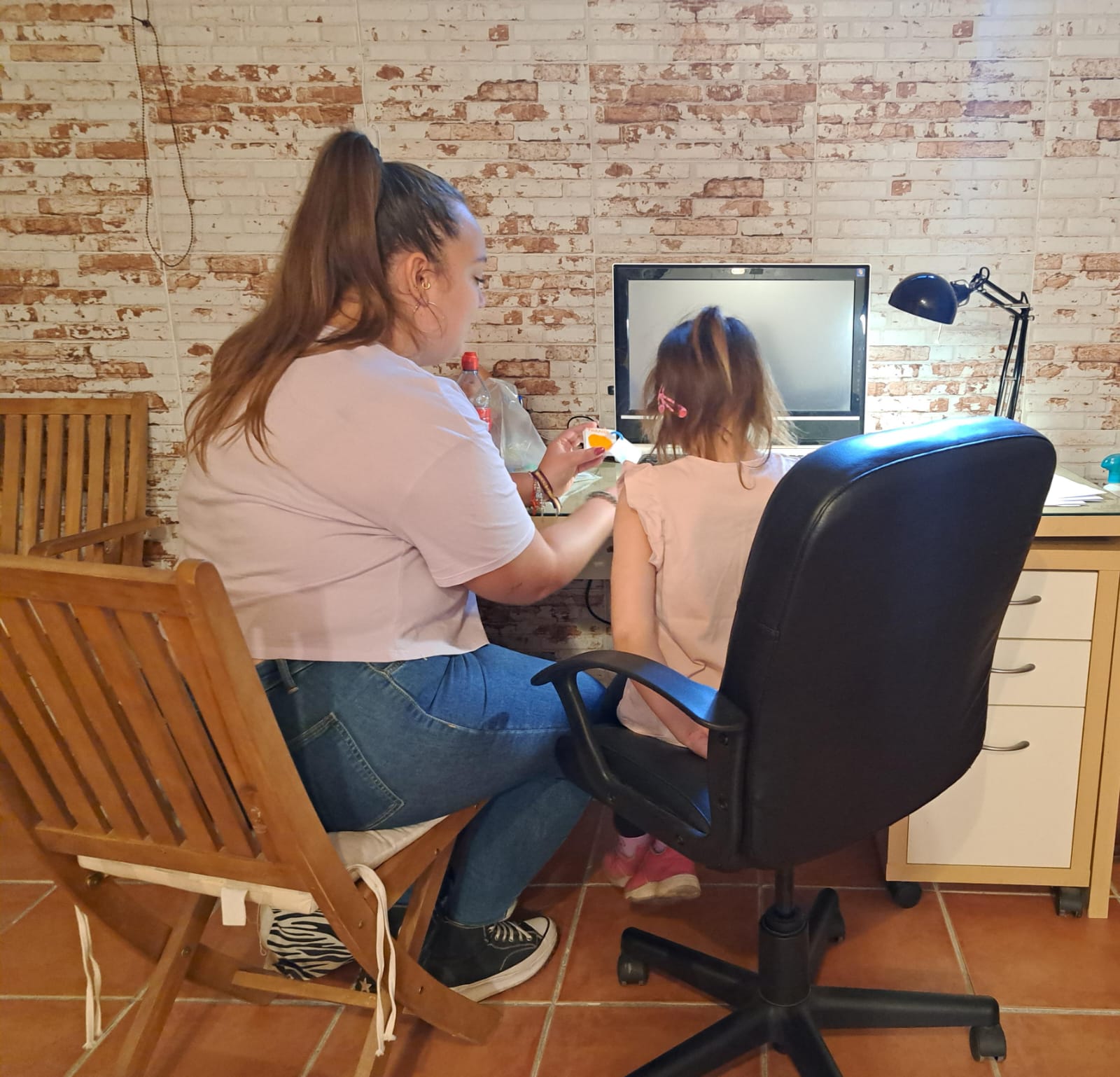 Niña afectada por Síndrome Kleesfstra dando el servicio de apoyo escolar con la profesional Angela López