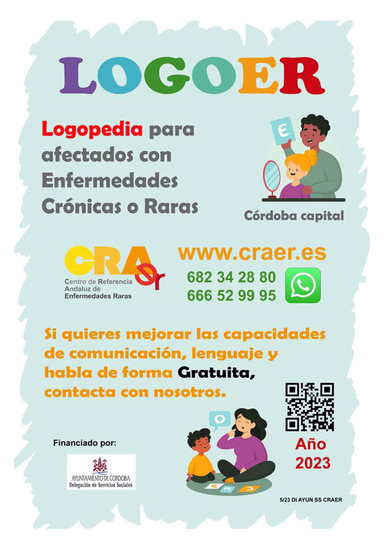 La Federación Centro de Referencia Andaluz de Enfermedades Raras (CRAER) ofrece apoyo escolar y sesiones de logopedia para menores afectados por una patología minoritaria y/o enfermedad crónica, progresiva o degenerativa gracias al proyecto “Apoyo directo y urgente a familias: Enfermedades Raras, crónicas, degenerativas y/o terminales” que financia la Delegación de Servicios Sociales del Ayuntamiento de Córdoba.